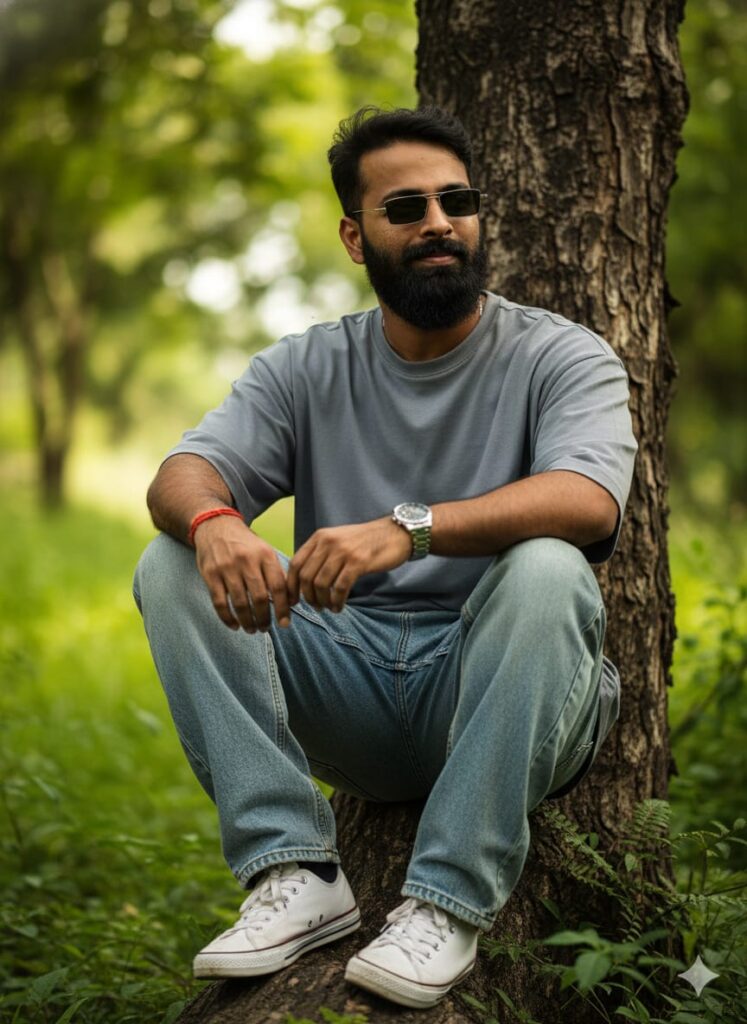 A hyper-realistic, cinematic portrait of a handsome young man in a relaxed *sitting pose against a natural tree trunk. He is wearing a loose-fitting/oversized **gray* t-shirt, baggy denim jeans, and stylish sneakers. He has a subtle, confident smile on his face. He is accessorized with a modern wrist watch, a *single red thread bracelet* (dhaga), and fashionable sunglasses. The background is a *vibrant, lush green natural environment, shot with a telephoto lens to create an **extreme depth of field* and *smooth DSLR bokeh blur. **Cinematic dramatic lighting, **ultra-detailed clear face, **realistic skin texture*, 8K photo quality. Don't change faces