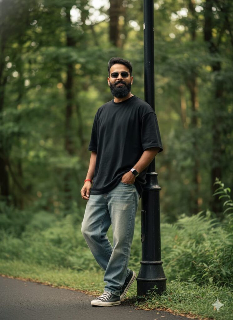 A hyper-realistic, cinematic portrait of a handsome young man in a dynamic standing pose, leaning casually against a classic light pole. He is wearing a loose-fitting/oversized black t-shirt, baggy denim jeans, and stylish sneakers. He has a subtle, confident smile on his face. He is accessorized with a modern wrist watch, a single red thread bracelet (dhaga), and fashionable sunglasses. The background is a vibrant, lush green natural environment, shot with a telephoto lens to create an extreme depth of field and smooth DSLR bokeh blur. Cinematic dramatic lighting, ultra-detailed clear face, realistic skin texture, 8K photo quality. Don't change faces