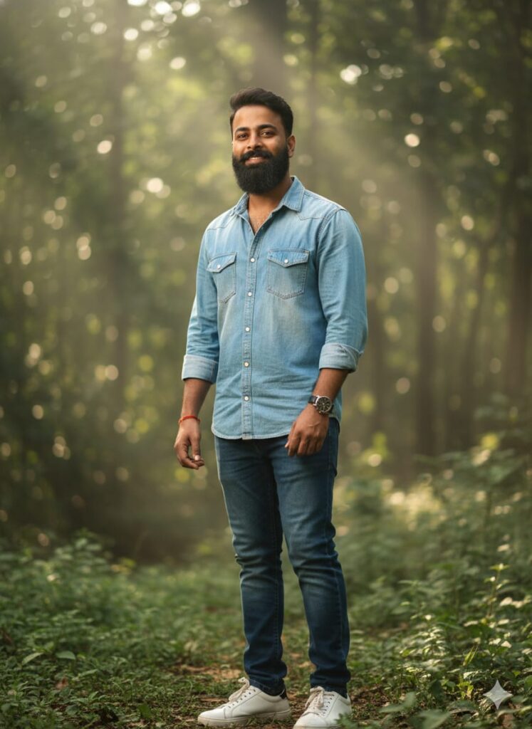 Ultra-Photorealistic 8K HD image of a handsome young man, with a clear and detailed face. He is standing naturally, wearing a casual outfit (denim shirt, jeans, and stylish sneakers). He has a subtle, engaging smile. He is wearing a wrist watch and a traditional red thread ('dhaga') on his hand. The background is a natural, lush green environment with a strong *DSLR-style bokeh effect* (shallow depth of field) to create a beautiful blur. Use *cinematic volumetric lighting* and focus for high-quality, sharp detail. Don't change faces