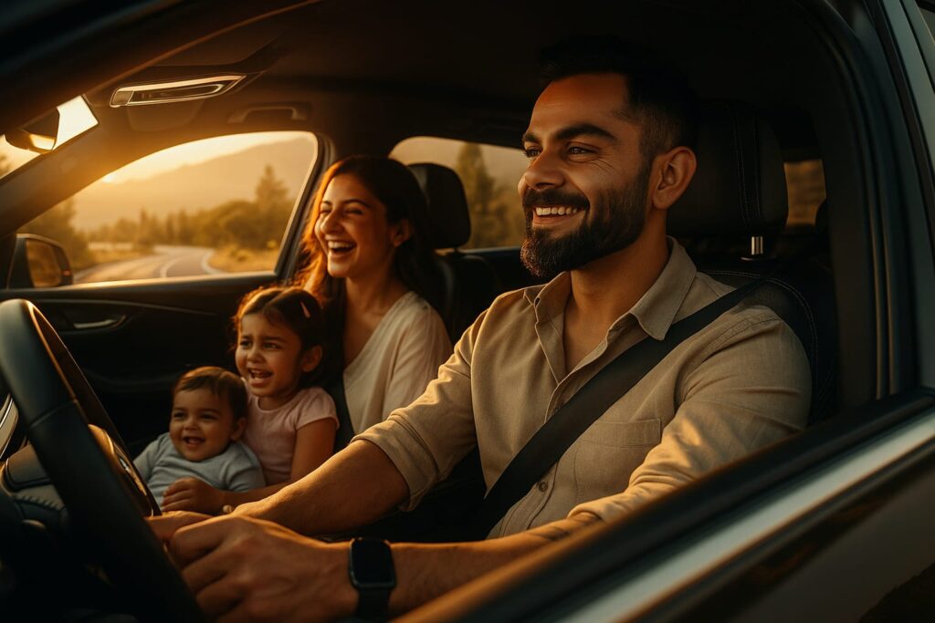 “Cinematic photo of Virat Kohli with his family driving in a stylish car on a scenic road. The car has a modern, luxurious look with sunlight streaming through the windows, casting warm golden tones. Virat is in the driver’s seat wearing casual yet classy attire, smiling and enjoying the drive. His family sits comfortably, sharing laughter and joy. Outside the car, the road winds through beautiful landscapes with trees, mountains, or city lights depending on the mood. High-resolution, realistic lighting, shallow depth of field, and film-style color grading to create a heartwarming and cinematic family moment.”