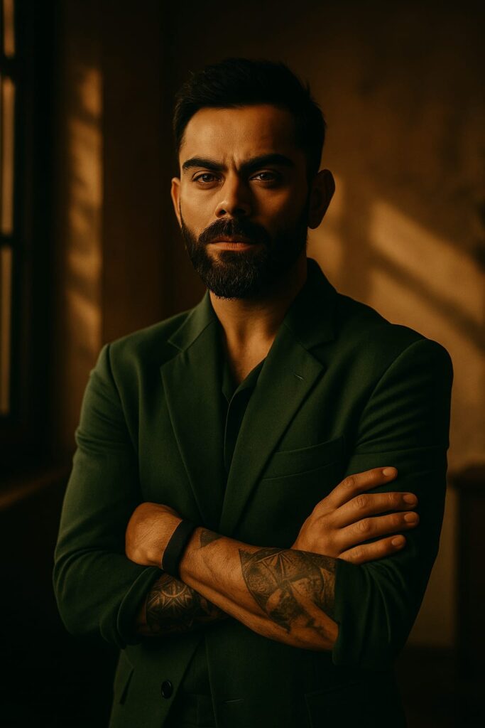 Cinematic portrait of Virat Kohli standing in a room, wearing a stylish green outfit. The room has soft natural light coming through a window, casting dramatic shadows across the walls. Background features minimal decor with a warm cinematic tone, creating a classy and intense atmosphere. High-resolution, realistic lighting, shallow depth of field, sharp details on face, film-style color grading.”