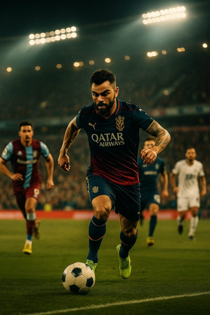 “Cinematic action scene of Virat Kohli playing football in a packed stadium under floodlights. He is wearing a professional football kit, sprinting with intensity while dribbling the ball past defenders. Other players in realistic football jerseys chase and defend, with the crowd in the background cheering passionately. The atmosphere is dramatic with stadium lights casting strong highlights and shadows, motion blur on the ball and players to capture speed, and a film-style color grading for an epic, high-resolution sports moment.”