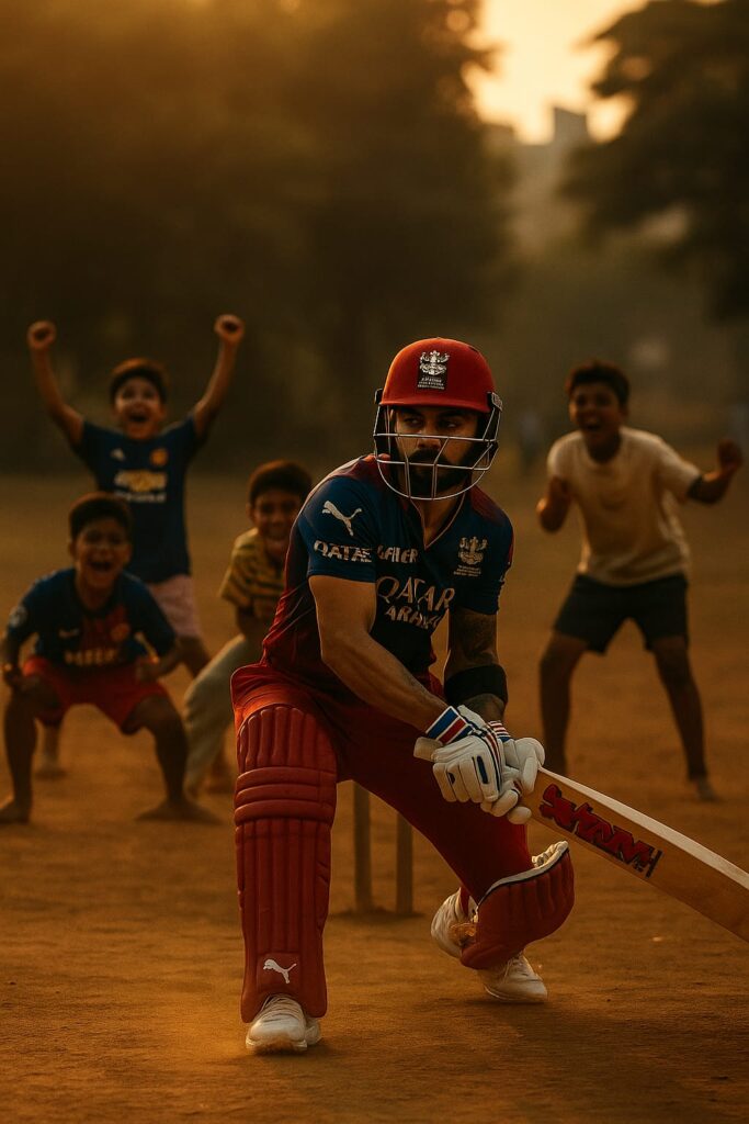 Cinematic photo of Virat Kohli in full cricket kit, playing cricket with children on a local ground. The pitch has natural daylight shining through with warm golden tones, creating a dramatic atmosphere. Virat is batting while children cheer and field with excitement, capturing the joy of street cricket mixed with a professional touch. Realistic lighting, shallow depth of field, high-resolution details, with a film-style color grading for an inspiring and heartwarming scene.