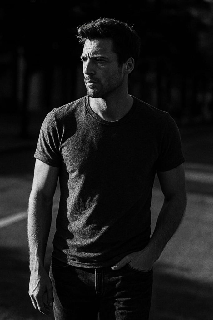 A black and white photograph of a man in casual clothes standing outdoors, looking to the side, sunlight casting dramatic highlights and shadows on his face and body, cinematic street photography style, high contrast monochrome tones, realistic and natural atmosphere.