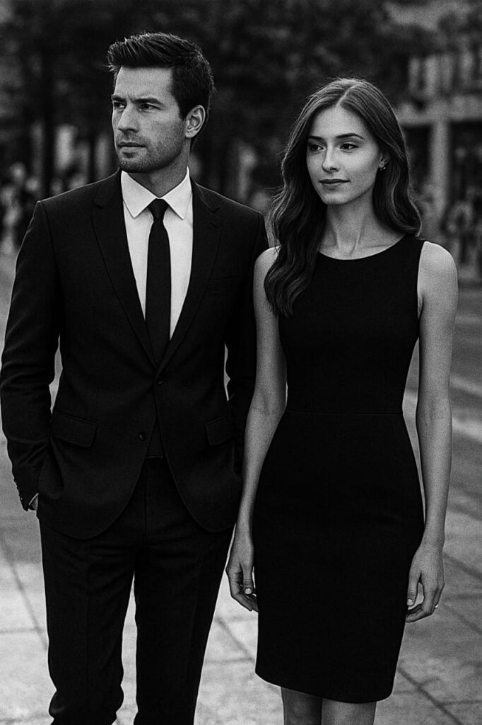 A black and white photograph of a man wearing a full formal suit standing beside a young woman, both looking elegant. The atmosphere is candid and realistic, cinematic street photography style, high contrast monochrome tones, natural and timeless feel.