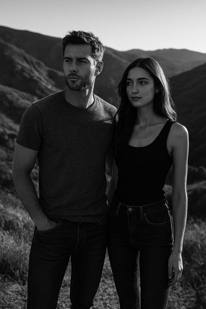 A black and white photograph of a man in casual clothes standing on scenic hills beside an attractive young woman. The background shows dramatic hill landscapes, sunlight creating strong highlights and shadows, cinematic photography style, high contrast monochrome tones, natural and artistic atmosphere.