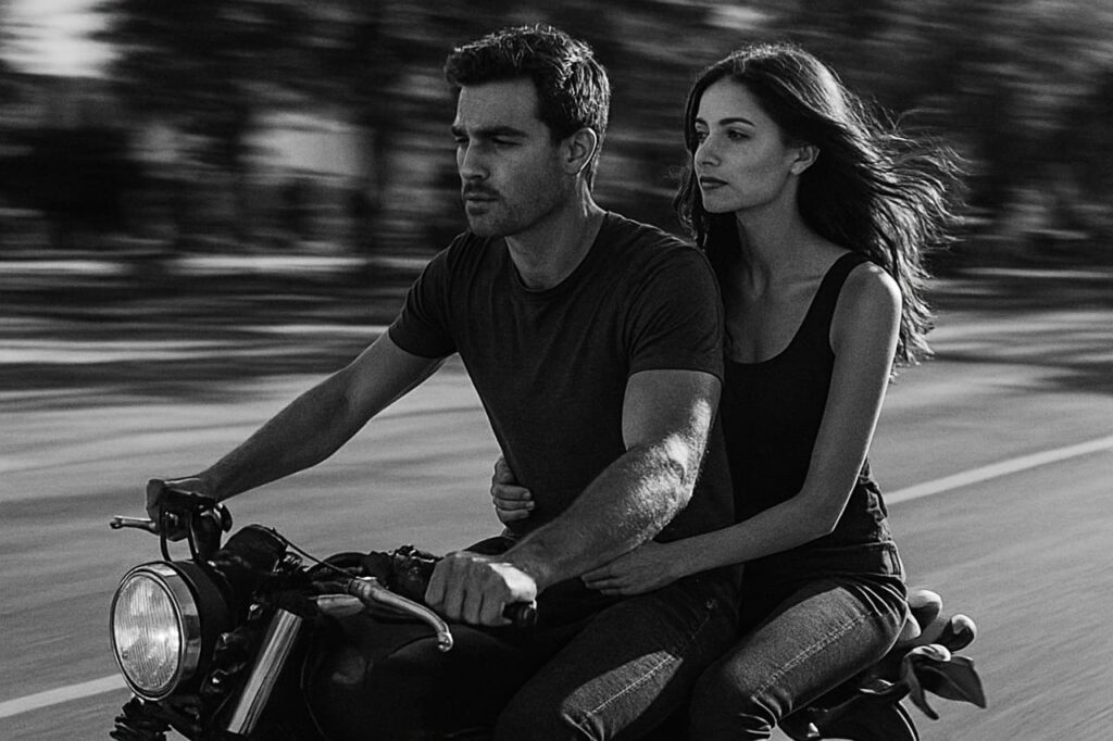 A black and white photograph of a man in casual clothes riding a motorcycle on the road with an attractive young woman sitting behind him. Sunlight creates dramatic highlights and shadows, cinematic street photography style, realistic motion blur, high contrast monochrome tones, natural and artistic atmosphere.