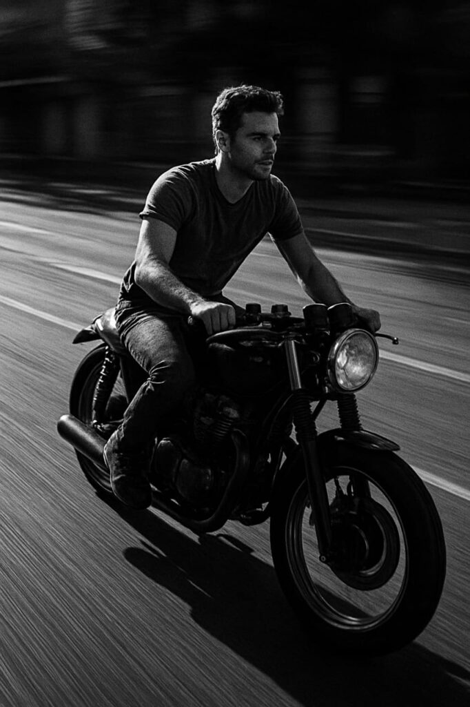 A black and white photograph of a man in casual clothes riding a motorcycle on the road, strong sunlight casting dramatic shadows, cinematic street photography style, realistic motion blur, high contrast monochrome tones, artistic and natural look.
