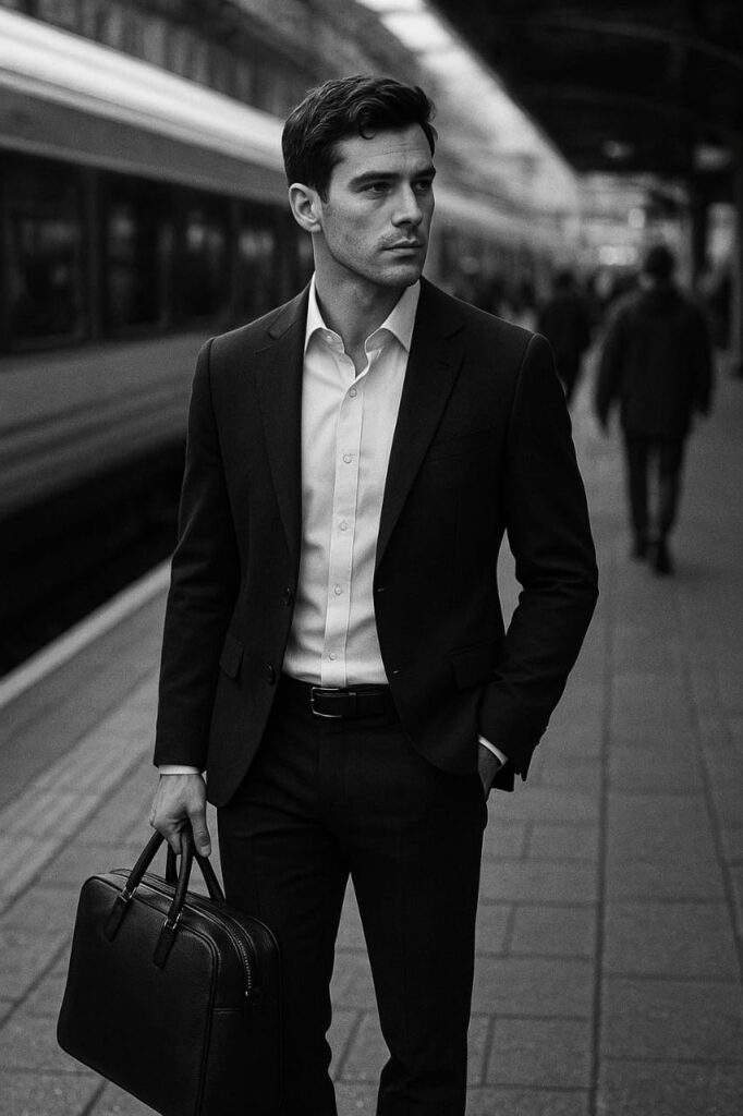 A black and white photograph of a man wearing formal attire (shirt, trousers, blazer), holding a sleek bag, standing on a train station platform. The atmosphere is candid and realistic, people and trains in the background, cinematic street photography style, high contrast monochrome tones.