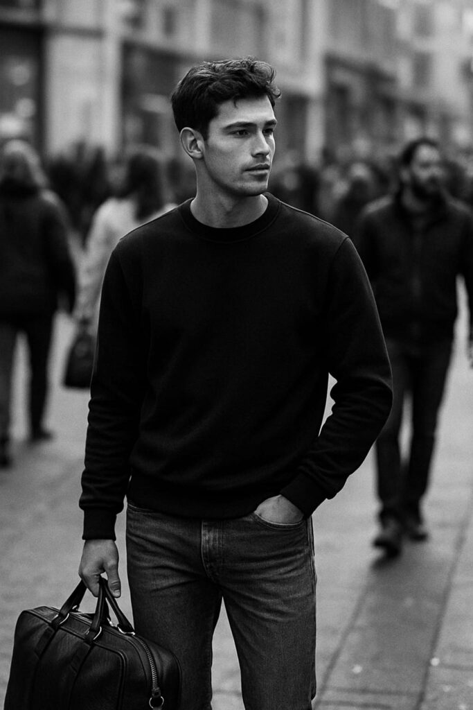 A black and white photograph of a young man wearing casual modern clothes, holding a stylish bag, standing in a busy public place. The atmosphere looks candid and natural, people walking around in the background, realistic street photography style, high contrast black and white tones, cinematic feel.