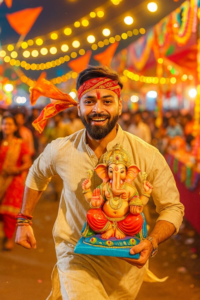 A festive scene of Ganesh Chaturthi celebration. A young man is joyfully running in a crowded fair, holding a beautifully decorated idol of Lord Ganesha in his hands. He is wearing a traditional kurta, with a bright red and yellow chunari tied on his forehead. The background is filled with colorful lights, people celebrating, flags, and festive stalls, creating an atmosphere of joy and devotion. The man’s expression is full of happiness and energy as he rushes through the mela.
