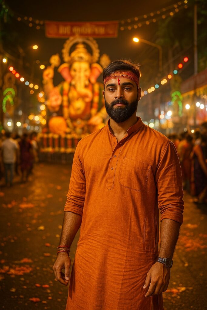 Cinematic photo of a man standing on a road during Ganesh Chaturthi, right in front of a grand idol of Lord Ganesha. The man is wearing a saffron (bhagwa) traditional outfit with a chundari tied on his forehead. The street is decorated with flowers, colorful lights, and festive banners. People in the background are celebrating with devotion. The scene has warm golden lighting, realistic textures, and a spiritual, festive atmosphere.”