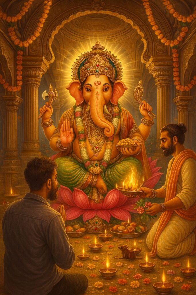 "A beautifully detailed image of Lord Ganesha seated majestically on a lotus inside a grand Hindu temple. Ganesha is adorned with a golden crown, ornaments, and traditional attire, radiating divine light. In front of him, a devotee is praying with folded hands, while a priest (pujari) dressed in traditional dhoti and angavastram performs rituals with aarti plate, flowers, and incense. The temple is decorated with marigold garlands, diyas, and intricate carvings, creating a divine and spiritual atmosphere."