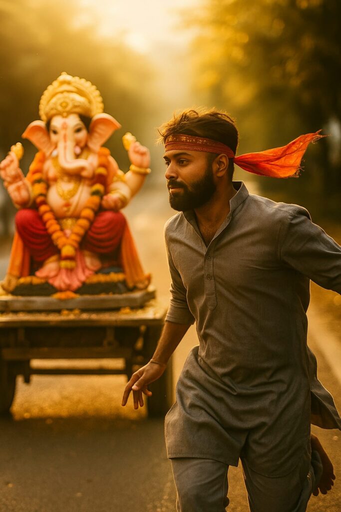 "A divine scene on a road where Lord Ganesha’s idol is placed. A young man runs behind the idol with devotion, wearing traditional attire, with a bright orange-red 'chundari' tied on his forehead. The atmosphere feels festive and spiritual, with soft golden light and slight motion blur showing movement."