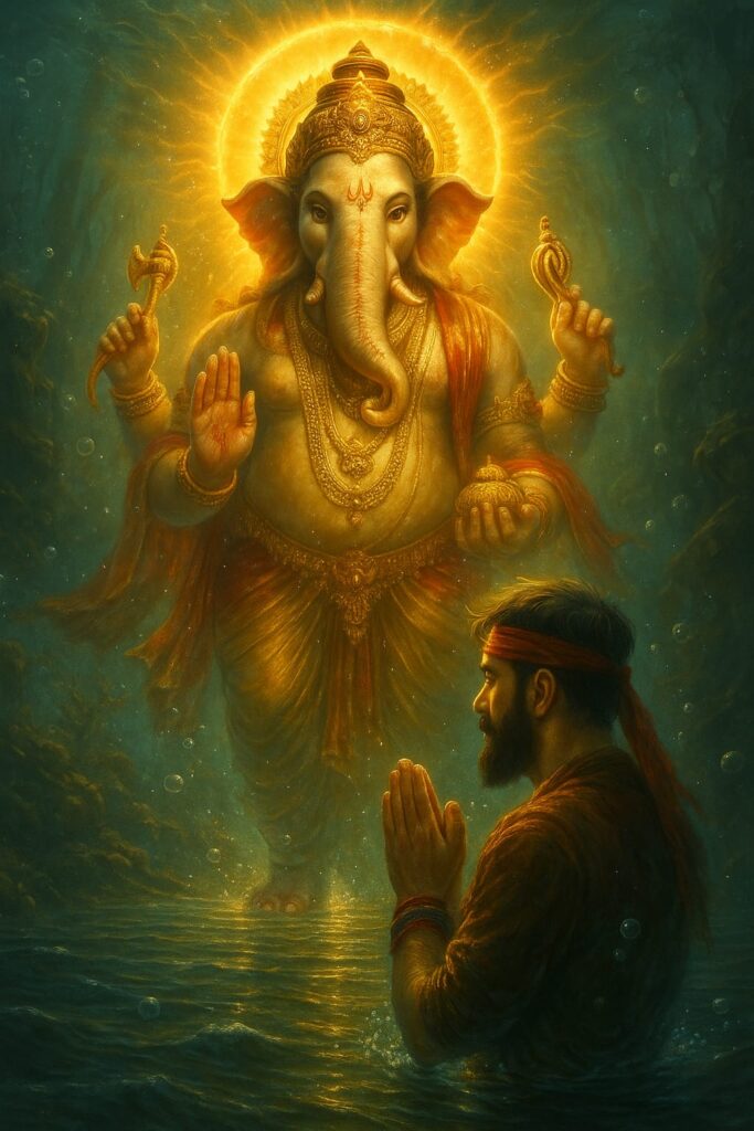 Lord Ganesha standing gracefully underwater, divine aura around him, glowing light illuminating his form, detailed ornaments, calm and powerful expression. A devotee standing in front of him inside the water, hands folded in prayer, with a red chunari tied on his forehead, showing deep devotion. Water reflections, divine spiritual atmosphere, realistic details, vibrant colors, cinematic lighting."