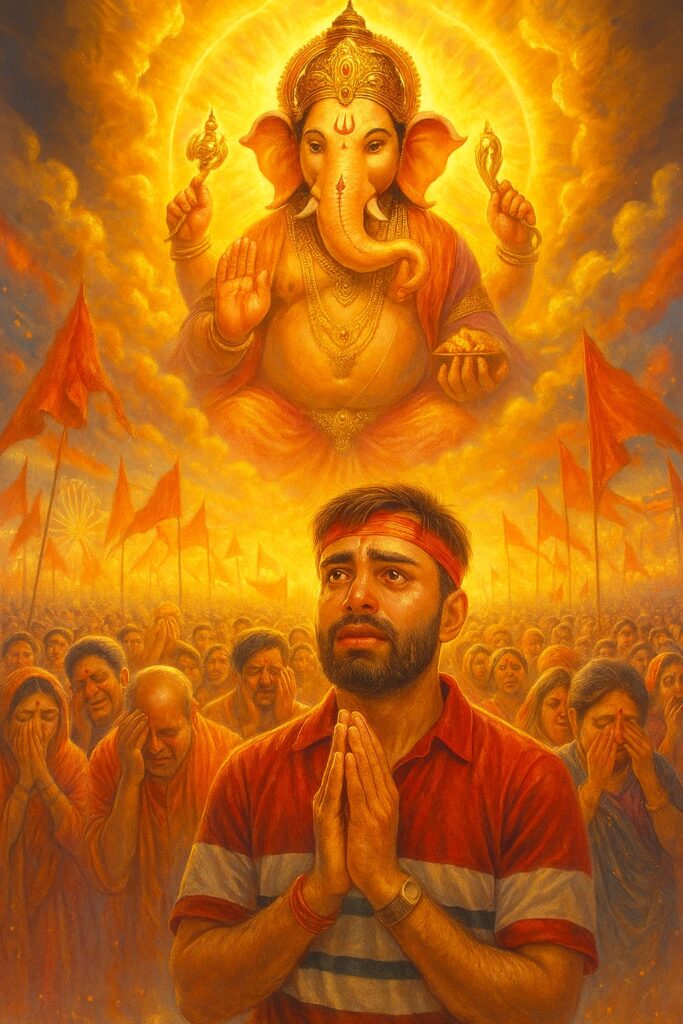 "Lord Ganesha (Ganesh Bhagwan) in the sky, glowing divine aura, large crowd of devotees praying with folded hands, many people crying with devotion, emotional expressions, colorful fair (mela) atmosphere, spiritual energy, saffron and red flags, a devotee with 'chundari' tied on forehead, vibrant Indian festival scene, dramatic lighting, divine clouds, emotional atmosphere."
