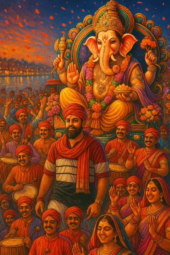 "A grand Ganesh Chaturthi celebration scene, Lord Ganesha idol beautifully decorated on a truck surrounded by many devotees. A man is leading the procession towards the Ganga river for visarjan. The crowd is joyous, men and women wearing colorful traditional clothes, everyone has a red chunari tied on their forehead. The streets are filled with energy, people dancing, playing dhol and drums. The background shows the holy Ganga river with evening lights, festive atmosphere, vibrant colors, and divine spiritual vibes."
