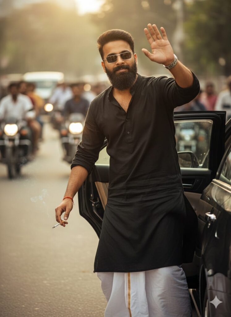 "A realistic depiction of a young man with a slightly smiling face, wearing sunglasses, stepping out of a luxury car. He holds a cigarette with smoke in his right hand and is wearing a watch. He is dressed in a black shirt and a white lungi. His left hand, with a red thread, is waving goodbye to people. Clear face with cinematic lighting, focusing light on his face." Don't change faces