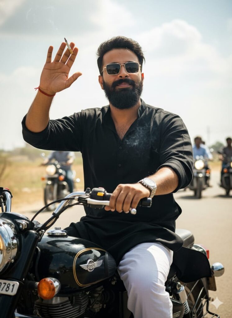 "A young man with a realistic, ever-changing face, wearing a black kurta and white lungi, stands with a slight smile and sunglasses. In his right hand, he sports a watch and a cigarette. His left hand, adorned with a red thread, waves goodbye. He leans casually against a luxury car, striking a handsome pose. The image features cinematic lighting with a clear, HD face, and a focused light on his face." Don't change faces