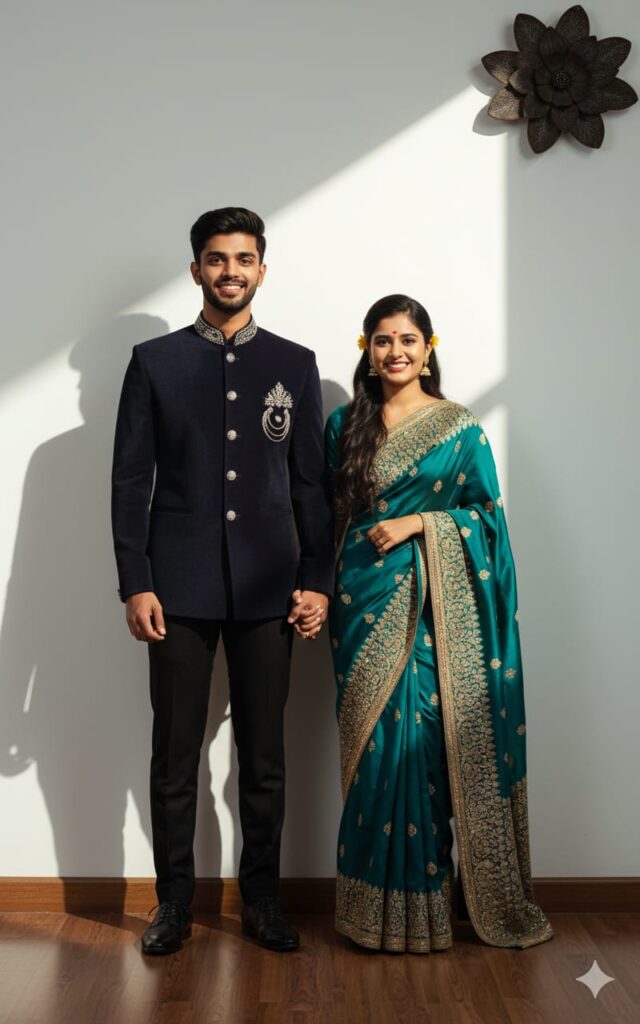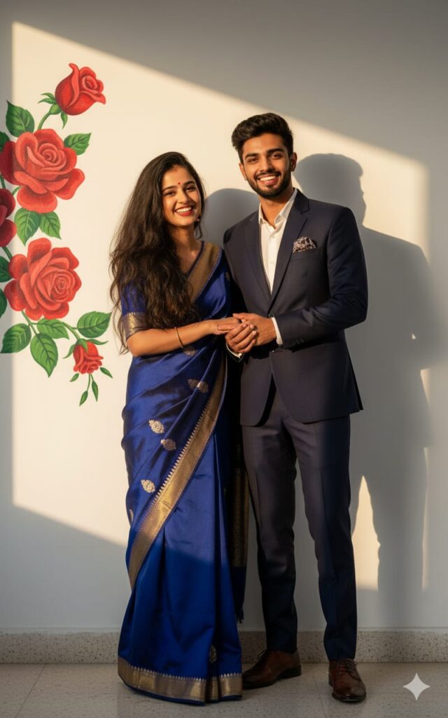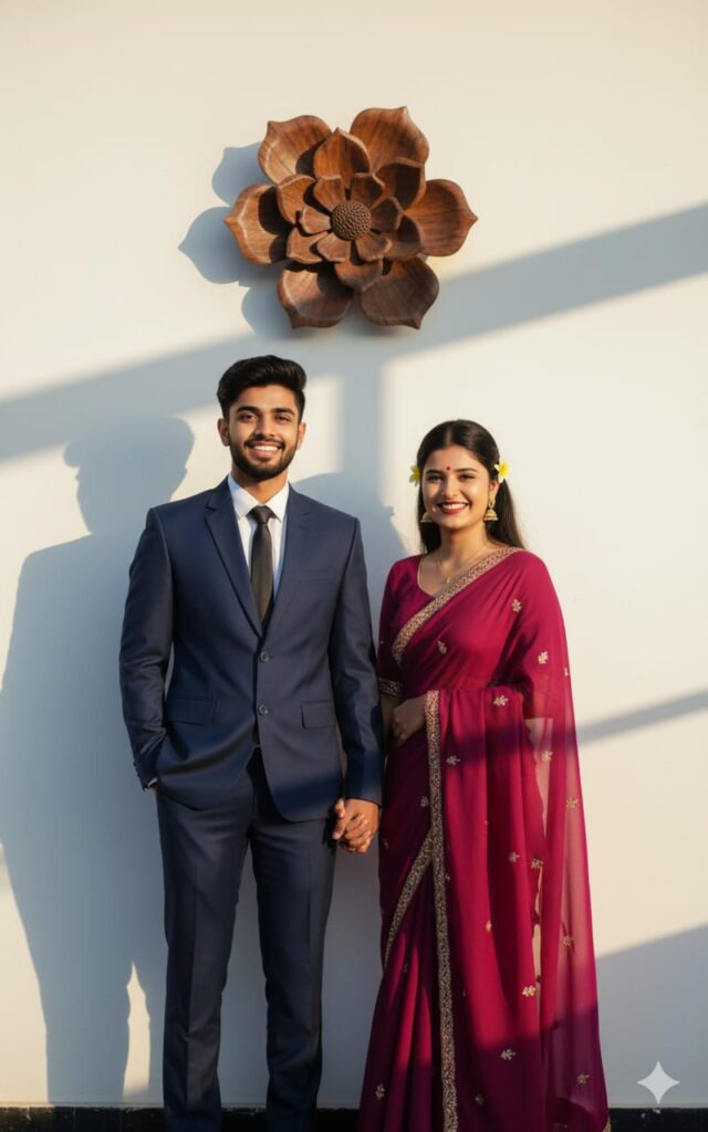 A cinematic, photorealistic image of a young couple. The young man is holding the young woman's hand, and they are both smiling. The woman has long, thick hair with a small flower in it and is wearing a fitted saree. The man is in formal attire. Both of their faces are illuminated by warm sunlight. Their full bodies are visible, with their shadows cast on the white wall behind them, which is adorned with a large flower on one side. Ultra-detailed, 8K, romantic, breathtaking colors.