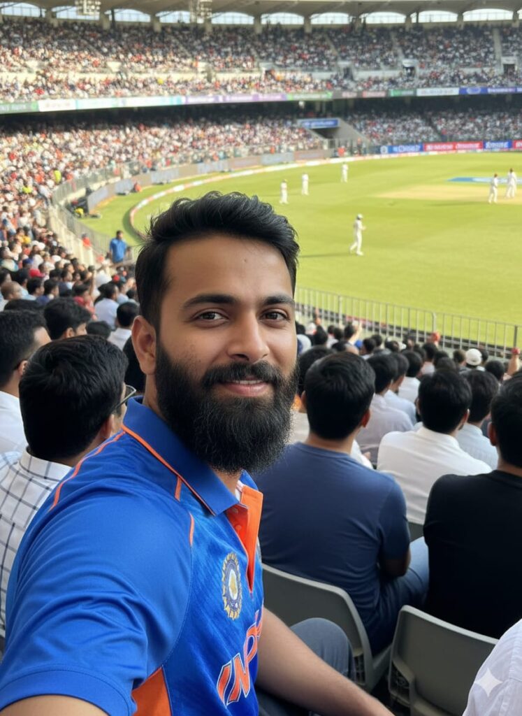 A hyper-realistic, high-definition (HD) photograph of a young Indian man with a completely changed, realistic, and detailed face. He is lightly smiling and looking directly at the viewer. He is wearing the Indian Cricket Team uniform. He is sitting in the stands of a large, packed cricket stadium, surrounded by other spectators, intently watching a match. In the background, Indian cricket players are visible playing on the field. Cinematic lighting, natural light, real-life photography style. Don't change faces