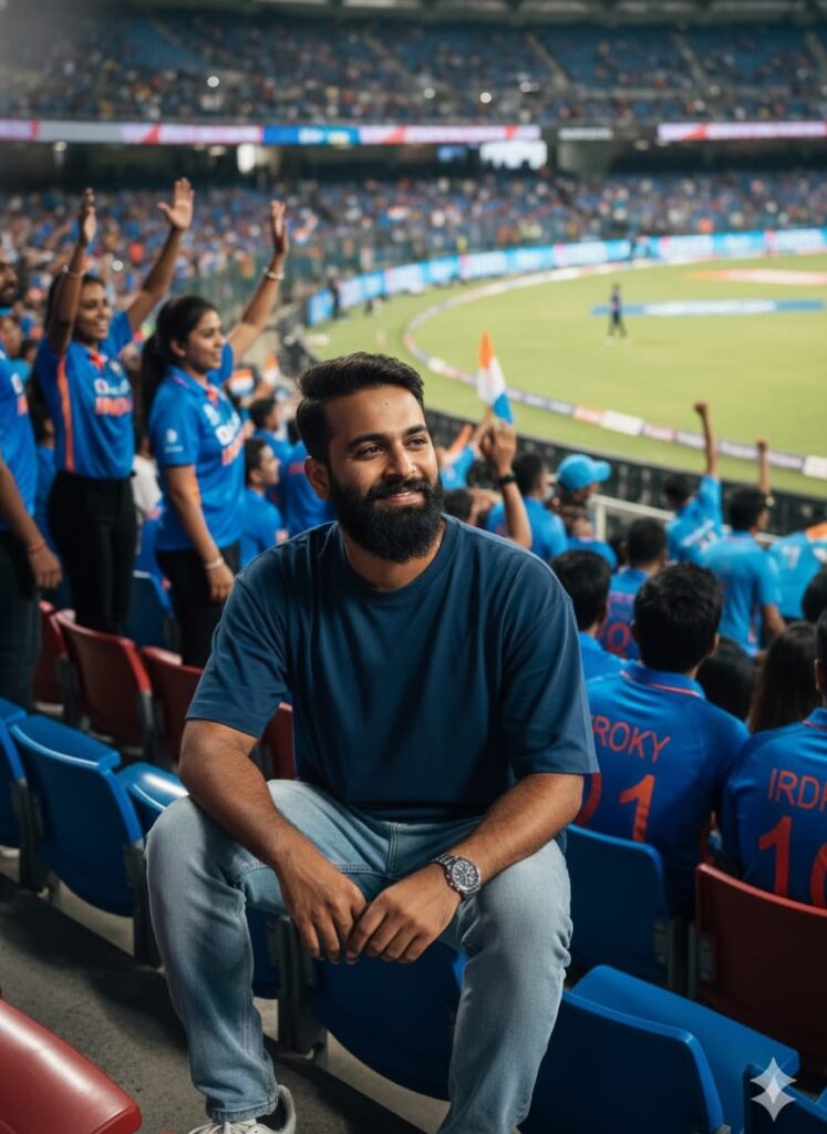 A photorealistic image of a young man with a distinct, expressive face sitting in the auditorium section of a large cricket stadium. He is casually dressed in jeans, an oversized t-shirt, and sneakers, wearing a watch. He is captured in a slight, subtle smile. In the background, other spectators wearing Indian cricket team jerseys are cheering and watching the match. The scene should have dramatic, cinematic lighting, focusing a clear, high-definition light on his face. Don't change faces
