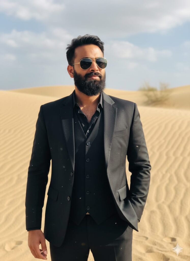 A stylish, confident man, middle-aged, wearing a black suit and aviator sunglasses, standing in a desolate, sandy, or desert-like environment. He has a charismatic and slightly smug expression, with a dramatic, movie-like quality to the lighting and composition. Don't change faces