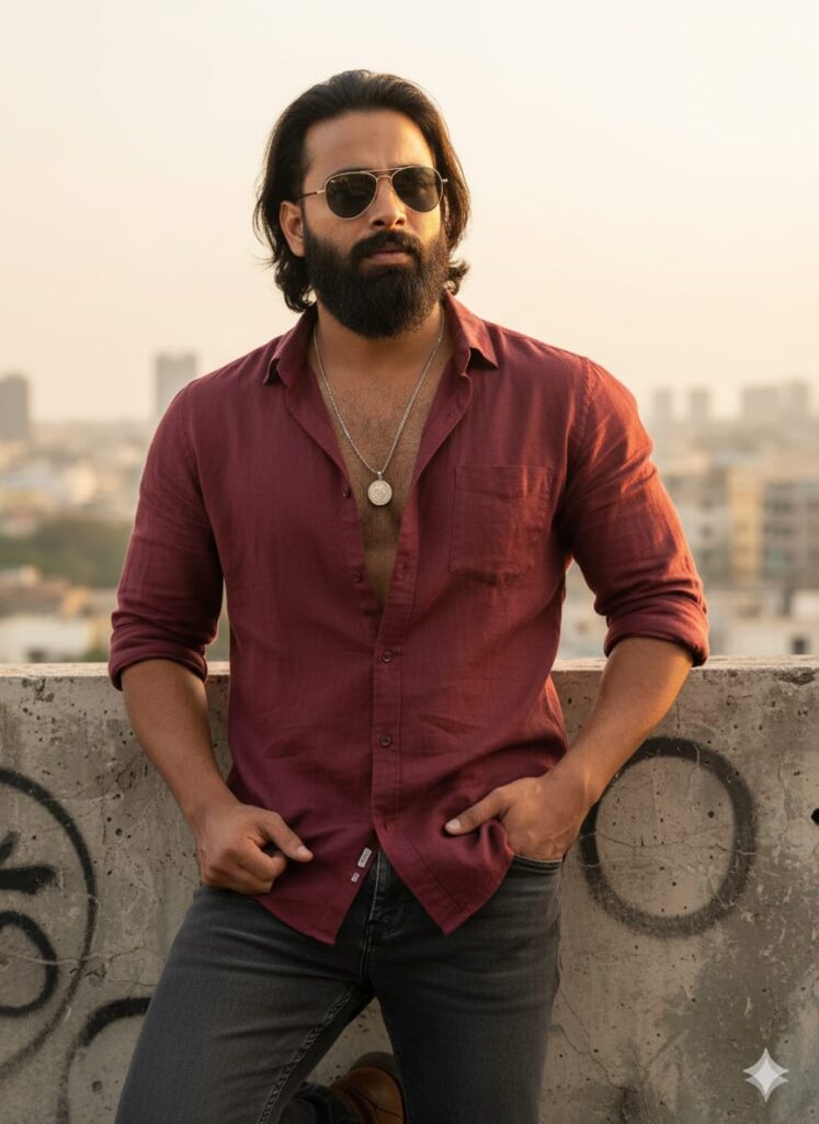 "A full body shot of a rugged, charismatic man with long, flowing dark hair and a thick, full beard. He is wearing a maroon or burgundy button-down shirt, left partially unbuttoned to show a necklace or pendant. He is wearing aviator-style sunglasses. The lighting is cinematic, highlighting his muscular build and strong, intense expression. He should be posed dynamically, perhaps standing confidently with hands in pockets or leaning against a stylish background." Don't change faces