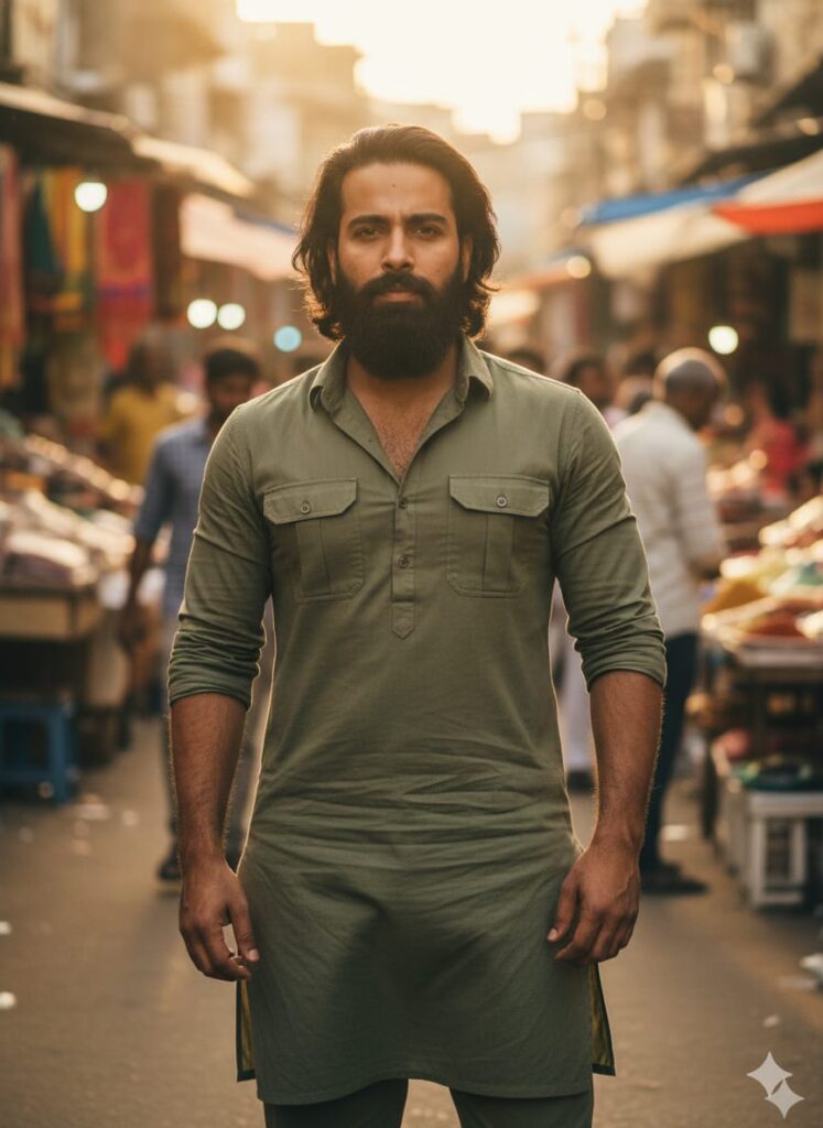 A cinematic full body portrait of a rugged, handsome Indian man in his early 30s with a full, well-groomed black beard and long, dark, windswept hair. He is wearing a dusty olive-gloden collared utility kurta pajama pathani. His gaze is intense and direct, looking straight into the camera. He stands in a crowded, busy street market (bazaar) in an Indian city, with soft-focus crowds and vibrant, warm, golden hour lighting creating a gritty, realistic atmosphere. Shallow depth of field, professional photography, high-resolution, film grain. Don't change faces