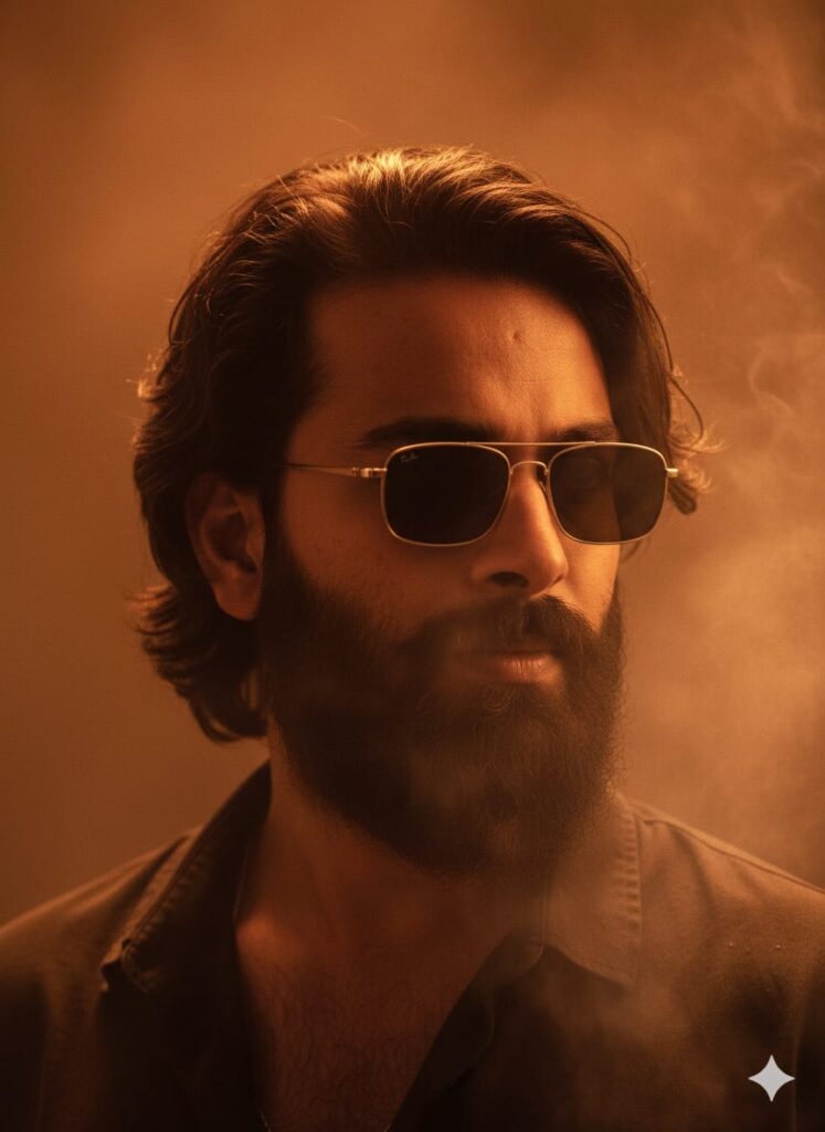 A dramatic, full portrait of a rugged man with a thick, dark beard and long hair, wearing rectangular metal-framed sunglasses, against a warm, hazy, orange-gold background with soft smoke effects. Cinematic lighting, low key, high contrast. Don't change faces