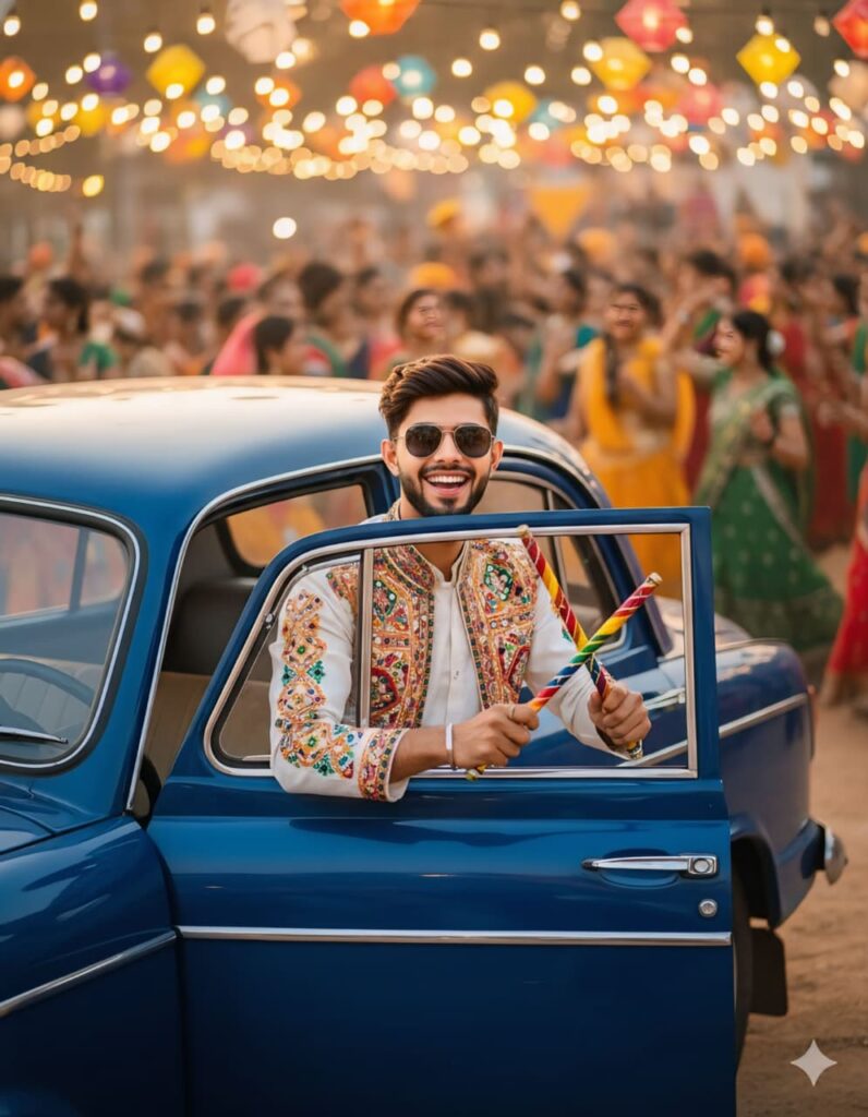 Create a highly realistic and cinematic portrait of a young man with a full of masti and joyful smile, wearing stylish sunglasses. He is in the dynamic action of getting out of a vintage car, actively playing Dandiya with a pair of sticks. He is wearing a traditional and vibrant Rajasthani ethnic white dress with bright details. The setting is a bustling and joyous Garba festival, with a large crowd of people dancing and celebrating in the slightly blurred background. The scene is illuminated by warm, colorful, and dramatic cinematic lighting, with a golden-hour feel that highlights his joyful expression and the energetic atmosphere. The final image should be a professional-quality, high-definition photograph, clear and sharp in focus. Include a note to swap the man's face with a provided reference image for a personalized and realistic touch.