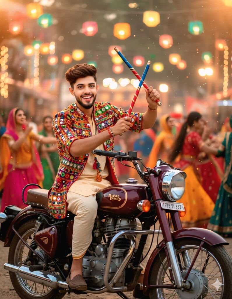 Create a highly realistic and cinematic portrait of a young man with a mischievous and joyful smile. He is sitting confidently on a vintage Royal Enfield Bullet motorcycle, but instead of riding, he is actively playing Dandiya with a pair of sticks. He is wearing a bright, traditional Rajasthani ethnic outfit with intricate details. The setting is a vibrant and crowded Garba festival, with many people dancing and celebrating in the slightly blurred background. The scene is illuminated by warm, colourful, and dramatic cinematic lighting, with a golden-hour feel. The final image should be a professional-quality, high-definition photograph, clear and sharp in focus. Include a note to swap the man's face with a provided reference image for a personalized and realistic touch.