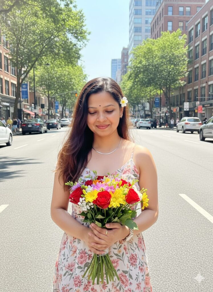 "A young girl with a changed, highly realistic face, standing and lightly smiling. She is wearing a sleeveless dress, with heels on her feet and open hair. A small white flower is in her hair near her head. She holds a rose bouquet in both hands. She has a thin chain around her neck. She is standing on a main road in the background, with traffic lights and shop crowds visible. Handsome, Cinematic lighting, HD quality, clear facial features." Don't change faces