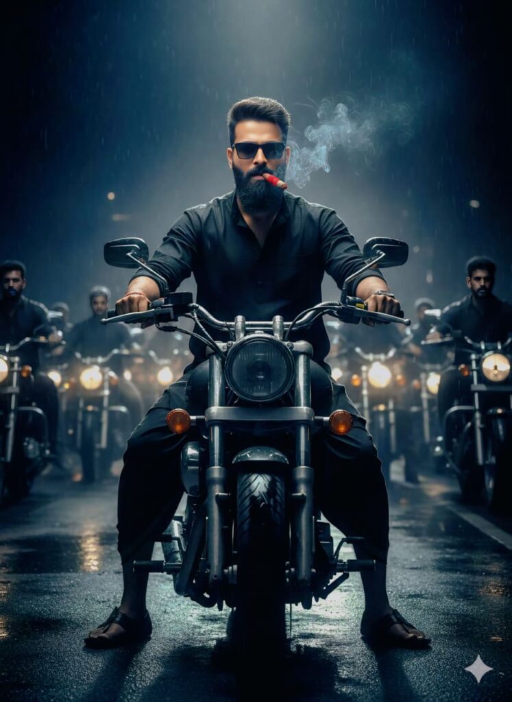 A young man with a transformed face, riding a bike on the road. There are many people on bikes behind him. He has a killer look and a front pose. He holds a cigar in one hand with a red thread wrapped around it. He is wearing black sunglasses and a full black South Indian dress. The background scene should be dark with cinematic lighting and a focus on his face, looking realistic. Do not change anything in this prompt.