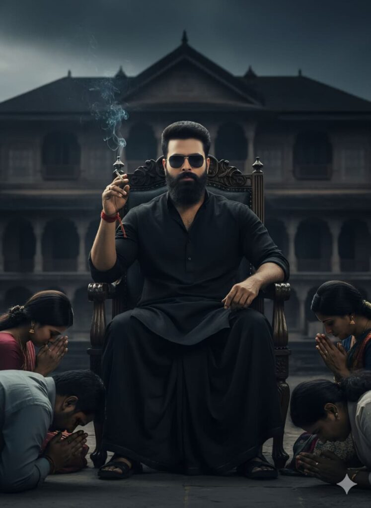 A young man with a face that can be changed, sitting on a long chair with a killer look and a front pose. In one hand, he holds a thick cigarette from which smoke is coming out, and the other hand is on the armrest, with a red thread wrapped around it. He is wearing black sunglasses and a South Indian full black dress. In front of him, many people are begging for forgiveness. In the background, there is a dark-colored haveli. The image should have cinematic lighting and a realistic feel, with the light focused on his face. No changes should be made to the described details.