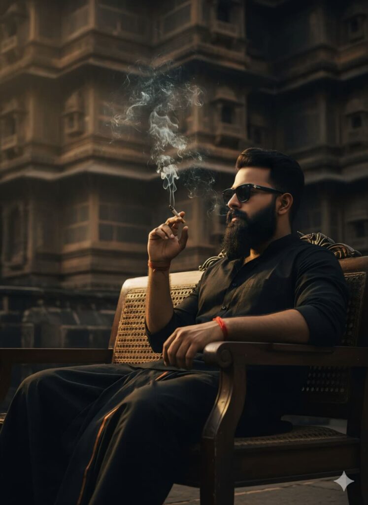 A young man is sitting on a long chair. He has a killer look with a side pose. In one hand, he holds a thick cigarette from which smoke is coming out, and the other hand is on the armrest, with a red thread wrapped around it. He is wearing black sunglasses and a South Indian full black dress. In the background, there is a dark-colored haveli. The image should have cinematic lighting and a realistic feel, with the light focused on his face. No changes should be made to the described details.