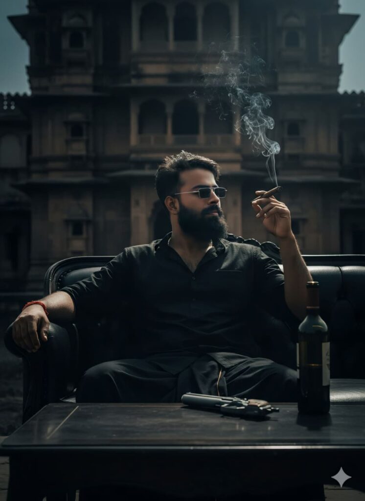 A young man with a transformed face, sitting on a long black chair with a serious side pose. In front of him is a table with a wine bottle and an artificial gun on it. He holds a thick cigar in one hand with smoke trailing from it, while his other hand is resting on the armrest. A red thread is wrapped around his hand. He is wearing black sunglasses and a full black South Indian dress. In the background is a haveli with a dark color palette. The image should have realistic and cinematic lighting, with the light focused on his face. Do not change anything in this prompt.
