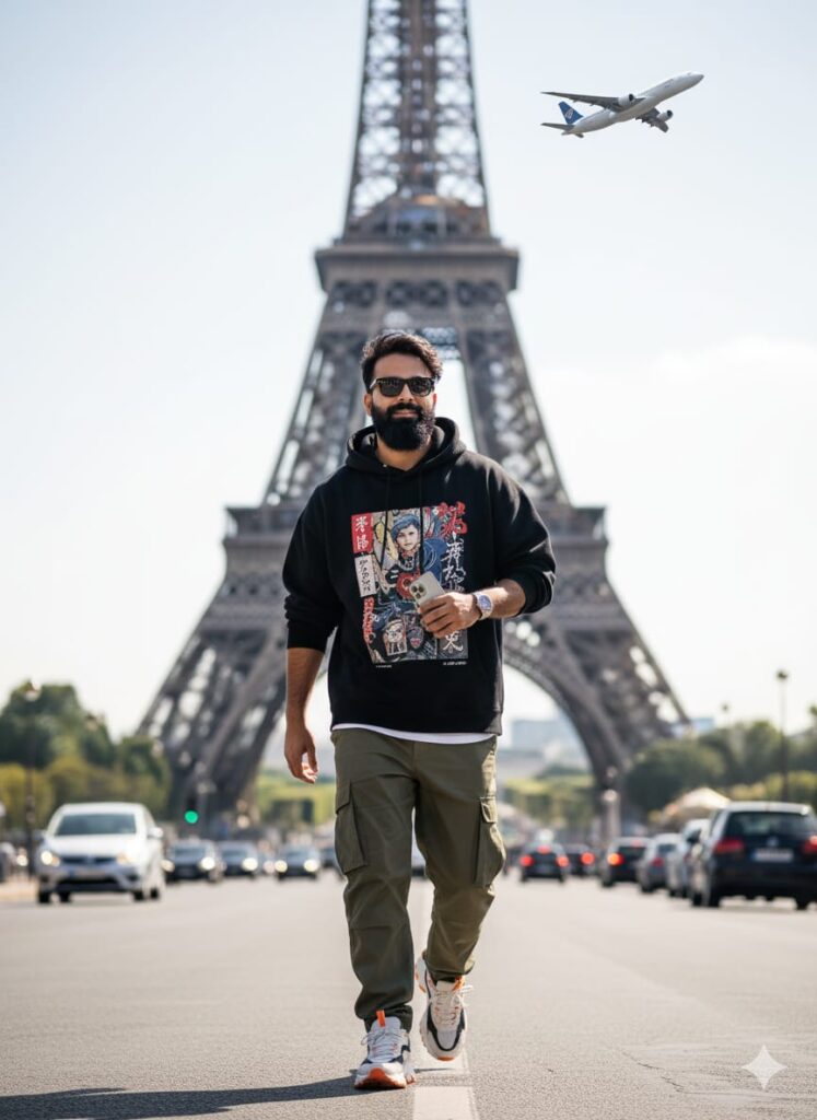 A dynamic, cinematic hyperrealistic full-body street portrait of a handsome young man with a confident, fast stride, captured mid-walk on the bustling boulevard directly in front of the iconic Eiffel Tower in Paris, France. He is wearing stylish sunglasses (black, modern frames) and has a subtle, engaging smile. His outfit is bold, funky, and cutting-edge streetwear, prominently featuring an OVERSIZED style (e.g., oversized graphic tee/hoodie and baggy cargo pants) paired with high-end sneakers. On one wrist, he is wearing a visible modern watch (color not specified), and he is holding a modern iPhone in his other hand. The background is a vibrant, high-traffic Parisian scene featuring the massive, wrought-iron structure of the Eiffel Tower dominating the view. The roadway is active with cars and people in dynamic motion blur, reflecting the movement of a busy tourist area. Crucially, a large commercial airplane (aeroplane) is visible flying high in the sky overhead, adding a sense of modern travel. The image style is that of a high-definition photograph taken with a real phone camera, utilizing strong depth of field (shallow DoF) to make the subject pop against the iconic landmark. The lighting is bright, dramatic, and sunny, with the main light source intensely focused on his face and head to illuminate his expression and the oversized silhouette. Ultra-detailed realism, sharp focus, 8K quality, dynamic urban scene, iconic travel aesthetic, blending modern fashion with an iconic global monument. Don't change faces