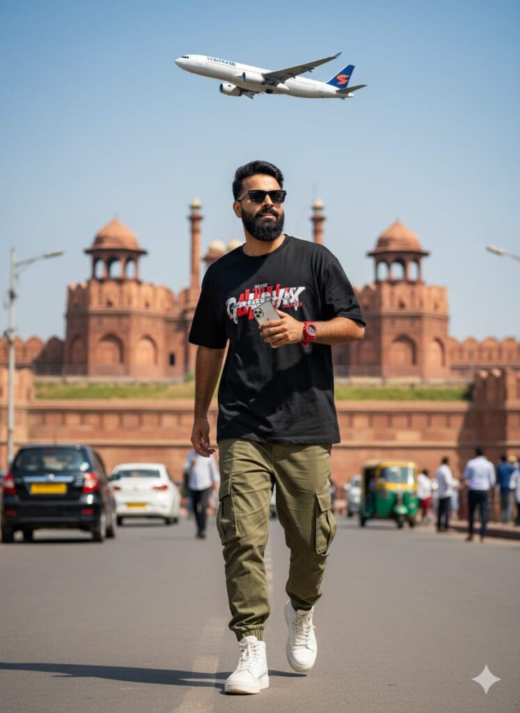 A dynamic, cinematic hyperrealistic full-body street portrait of a handsome young man with a confident, fast stride, captured mid-walk on the historical road directly in front of the majestic Red Fort (Lal Qila) in Old Delhi. He is wearing stylish sunglasses (black, modern frames) and has a subtle, engaging smile. His outfit is bold, funky, and cutting-edge streetwear, prominently featuring an OVERSIZED style (e.g., oversized graphic tee/hoodie and baggy cargo pants) paired with high-end sneakers. On one wrist, he is wearing a visible bold red watch, and he is holding a modern iPhone in his other hand. The background is a vibrant, high-traffic scene featuring the massive, red sandstone walls of the Red Fort dominating the view. The roadway is active with cars and people in dynamic motion blur, reflecting the bustling area near the monument. Crucially, a large commercial airplane (aeroplane) is visible flying high in the sky overhead, adding a juxtaposition of historical and modern travel. The image style is that of a high-definition photograph taken with a real phone camera, utilizing strong depth of field (shallow DoF) to make the subject pop against the iconic landmark. The lighting is bright, dramatic, and sunny, with the main light source intensely focused on his face and head to illuminate his expression and the oversized silhouette. Ultra-detailed realism, sharp focus, 8K quality, dynamic urban scene, iconic travel aesthetic, blending modern fashion with historical monument. Don't change faces