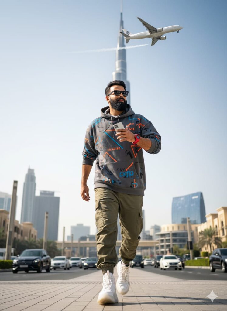 A dynamic, cinematic hyperrealistic full-body street portrait of a handsome young man with a confident, fast stride, captured mid-walk on the grand road directly in front of the Burj Khalifa in Dubai. He is wearing stylish sunglasses (black, modern frames) and has a subtle, engaging smile. His outfit is bold, funky, and cutting-edge streetwear, prominently featuring an OVERSIZED style (e.g., oversized graphic tee/hoodie and baggy cargo pants) paired with high-end sneakers. On one wrist, he is wearing a highly visible bold red watch, and he is holding a modern iPhone in his other hand. The background is an extremely busy, high-traffic downtown Dubai scene, featuring the majestic, towering Burj Khalifa dominating the skyline. The roadway is active with luxury cars and people in dynamic motion blur. Crucially, a large commercial airplane (aeroplane) is visible flying overhead in the sky, adding scale and a sense of movement. The image style is that of a high-definition photograph taken with a real phone camera, utilizing strong depth of field (shallow DoF) to make the subject pop against the iconic landmark. The lighting is bright, dramatic, and sunny, with the main light source intensely focused on his face and head to illuminate his expression and the oversized silhouette. Ultra-detailed realism, sharp focus, 8K quality, dynamic urban scene, iconic travel aesthetic. Don't change faces
