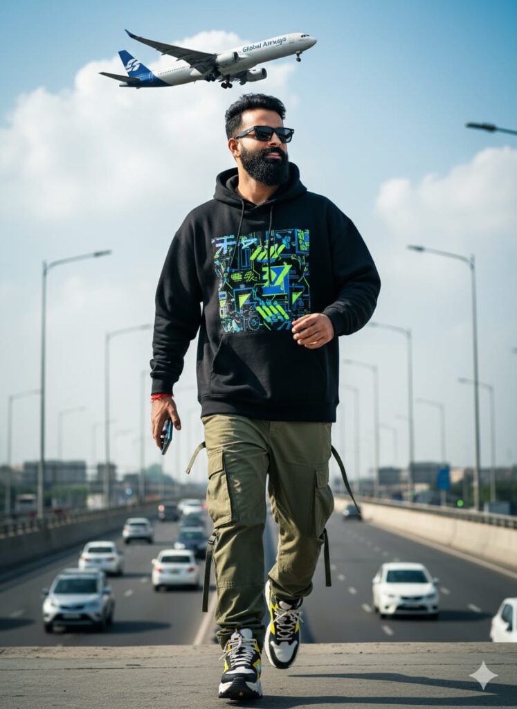 A dynamic, cinematic hyperrealistic full-body portrait of a handsome young man with a confident, fast stride, captured mid-walk on the elevated walkway of an overbridge/flyover. He is wearing stylish sunglasses (black, modern frames) and has a subtle, engaging smile. His outfit is bold, funky, and cutting-edge streetwear, prominently featuring an OVERSIZED style (e.g., oversized graphic tee/hoodie and baggy cargo pants) paired with high-end sneakers. On his right wrist, he has a visible red thread (Mauli/Kalaava), and he is holding a modern iPhone in his other hand. The background is a high-contrast scene: the roadway below the overbridge is busy with cars and people in dynamic motion blur. Crucially, a large commercial airplane (aeroplane) is visible taking off or flying high overhead in the sky, adding scale and a sense of movement. The image style is that of a high-definition photograph taken with a real phone camera, utilizing strong depth of field (shallow DoF) to make the subject pop. The lighting is bright and intentionally dramatic, with the main light source intensely focused on his face and head to illuminate his expression and the oversized silhouette. Ultra-detailed realism, sharp focus, 8K quality, dynamic street scene, action pose. Don't change faces
