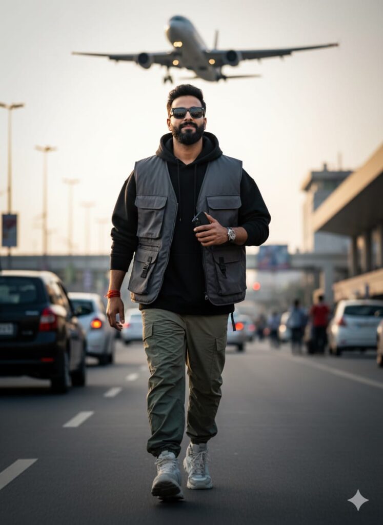 A dynamic, cinematic hyperrealistic full-body portrait of a handsome young man with a confident, fast stride, captured mid-walk on a high-traffic airport access road. He is wearing stylish sunglasses (black, modern frames) and has a gentle, subtle smile. His outfit is bold and cutting-edge streetwear, featuring highly pronounced OVERSIZED style—such as an oversized hoodie or jacket and baggy, athletic joggers, paired with high-top sneakers. On his right wrist, he has a prominent red thread (Mauli/Kalaava), and he is holding a modern iPhone in his other hand. The background is an extremely busy airport area, featuring cars and people in dynamic motion blur on the road. Crucially, a large airplane (aeroplane) is visible taking off or landing overhead in the sky, adding scale and drama. The image style is that of a high-definition photograph taken with a real phone camera, emphasizing depth of field and motion. The lighting is bright and intentionally dramatic, with the main light source intensely focused on his face and head to highlight his expression and the oversized silhouette. Ultra-detailed realism, sharp focus, 8K quality, dynamic street scene, travel aesthetic. Don't change faces