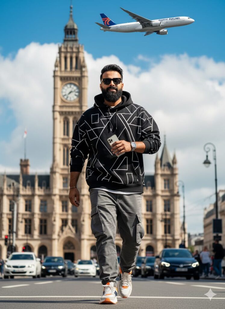 A dynamic, cinematic hyperrealistic full-body street portrait of a handsome young man with a confident, fast stride, captured mid-walk on the bustling boulevard directly in front of a majestic, historic Clock Tower (Clock Tower, such as Big Ben or similar European landmark style). He is wearing stylish sunglasses (black, modern frames) and has a subtle, engaging smile. His outfit is bold, funky, and cutting-edge streetwear, prominently featuring an OVERSIZED style (e.g., oversized graphic tee/hoodie and baggy cargo pants) paired with high-end sneakers. On one wrist, he is wearing a visible modern watch, and he is holding a modern iPhone in his other hand. The background is a vibrant, high-traffic European urban scene featuring the massive, detailed stone structure of the Clock Tower dominating the view. The roadway is active with cars and people in dynamic motion blur, reflecting the movement of a busy city center. Crucially, a large commercial airplane (aeroplane) is visible flying high in the sky overhead, adding a sense of modern travel. The image style is that of a high-definition photograph taken with a real phone camera, utilizing strong depth of field (shallow DoF) to make the subject pop against the iconic landmark. The lighting is bright, dramatic, and sunny, with the main light source intensely focused on his face and head to illuminate his expression and the oversized silhouette. Ultra-detailed realism, sharp focus, 8K quality, dynamic urban scene, iconic travel aesthetic, blending modern fashion with an iconic global monument. Don't change faces