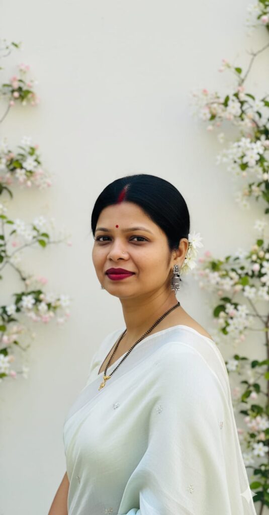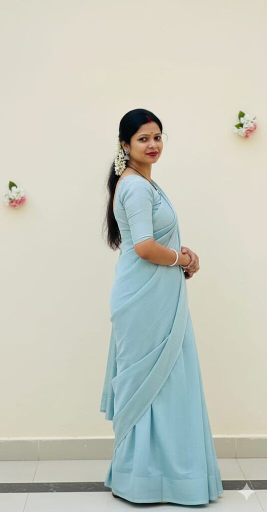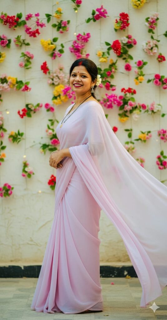 A cinematic and realistic full-body photo of an Indian girl with a face change effect, standing in a graceful side profile. She is smiling gently while looking over her shoulder. She wears a plain, elegant saree, and a delicate jasmine flower is tucked into her side-swept hair. The background is a clean, light-colored wall, with subtle, out-of-focus small flowers adding a touch of natural beauty. The image has a 3:4 aspect ratio and is rendered with natural, vibrant colors and soft, cinematic lighting.