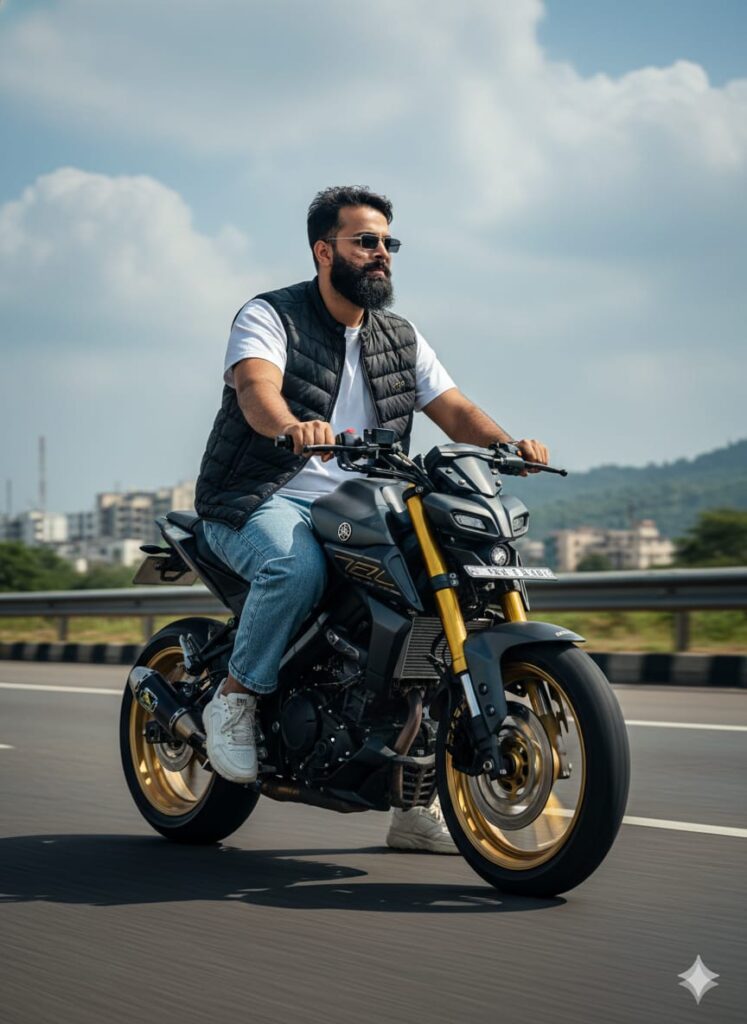 "Full body shot of a young man with a clear, realistic, and high-quality HD face (with a slightly altered or changed look), standing or leaning on a main highway. He is wearing a trendy streetwear outfit: loose, baggy jeans, an oversized full-sleeved shirt, a vest or half-jacket, and modern sneakers, accessorized with sunglasses. Next to him is a large-looking Yamaha MT-15 motorcycle. He is affectionately running his hand over the bike while looking away. The background is a natural, sunlit highway, captured with cinematic grading for a rich, high-resolution image." Don't change faces