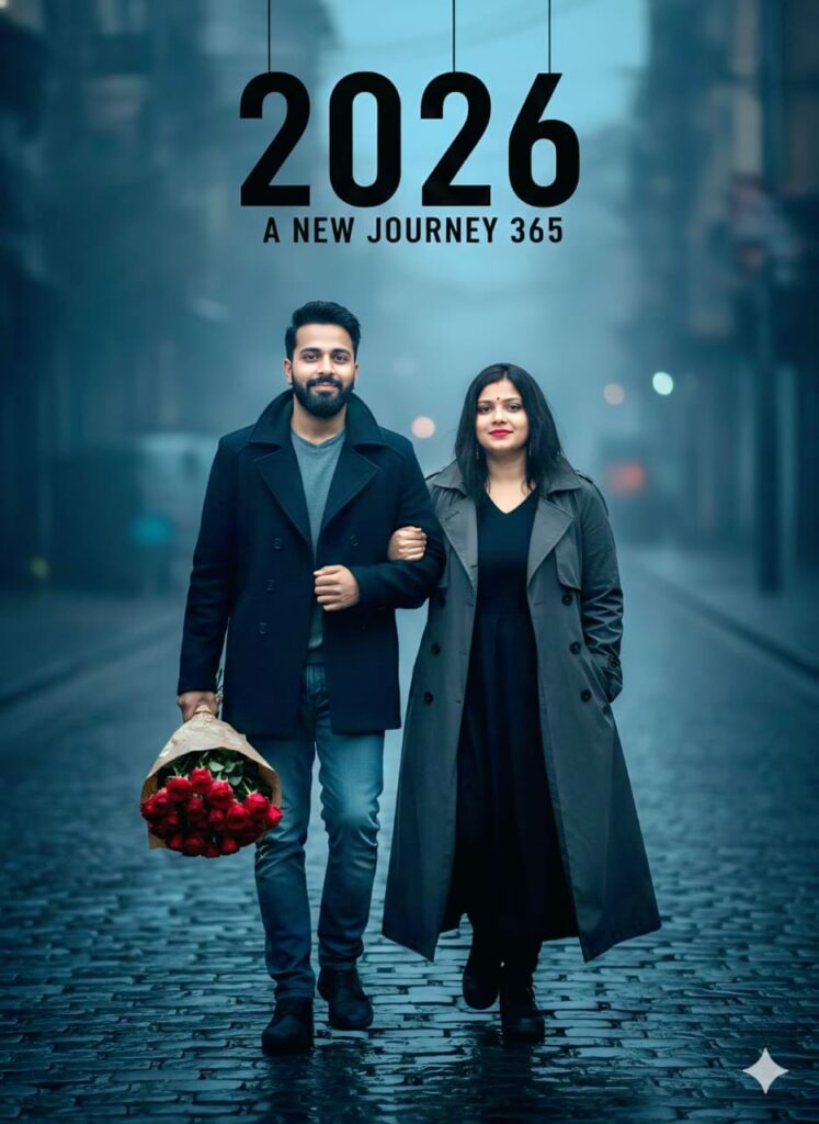A hyper-realistic, high-resolution photograph of a young couple walking on a road. The man, with a full-body appearance, is holding a bouquet of roses. The woman's face and the man's face are distinctly unique and realistic, slightly smiling. They are wearing casual attire with long jackets. The background is extremely blurred (bokeh effect), featuring dark blue and dark grey tones. Dominating the upper section is the large number "2026" in a deep, dark color. Directly below the number is the smaller text "A NEW JOURNEY 365". Cinematic lighting, real-life proportions, 8k. Don't change faces
