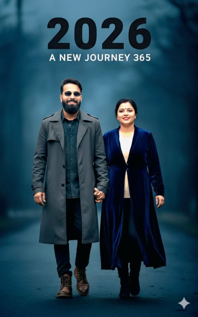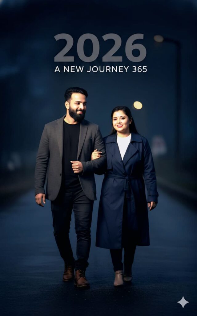 A photorealistic, highly detailed, close-up shot of a young couple (one man, one woman) walking, with their faces artfully merged and composited to appear completely unique, yet perfectly real and flawless. They are sharing a subtle, genuine smile, looking slightly towards the camera. The man is wearing a casual outfit with a long jacket, and the woman is similarly dressed in casual attire and a long jacket. They are walking on a dimly lit road. The background is an extreme, soft blur (shallow depth of field) of dark blue and dark gray tones, almost abstract. Centered above them, in a large, bold, dark-colored font: "2026". Directly beneath the year, in a smaller font: "A NEW JOURNEY 365". Don't change faces