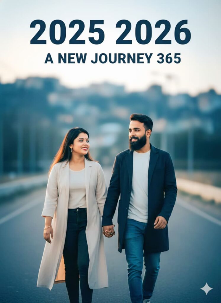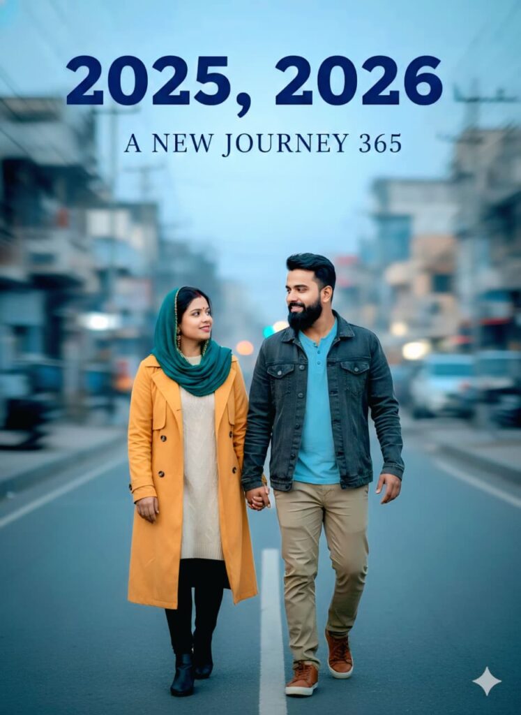 A photorealistic image of a young man and a woman (a couple) with a slight, genuine smile. They are dressed in casual attire, including long jackets. The focus is on them walking on a road. The background is extremely blurred (bokeh effect), featuring a blend of dark blue and light grey tones. The couple's faces are to be generated uniquely and realistically to appear like real people. Dominating the upper part of the image, in a large, dark-colored font, is the text "2025 2026". Directly beneath this, in a smaller size, is the text "A NEW JOURNEY 365". Full body shot. Don't change faces