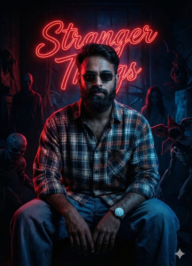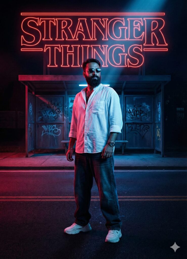 "A photorealistic cinematic portrait of a young man with a confident, cool expression, wearing stylish sunglasses. He stands firmly on a dark main road at night. Behind him is a deserted bus stop. He is dressed in trendy oversized streetwear: baggy jeans, a loose 'free size' shirt, chunky sneakers, and a wristwatch. The entire scene is bathed in dramatic 'Stranger Things' style dual-tone neon lighting, mixing deep reds and electric blues. Large, glowing cursive neon script spelling "STRANGER THINGS" dominates the background signage. A sharp beam of light focuses specifically on his face and sunglasses. 8k resolution, hyper-detailed, film grain." Don't change faces