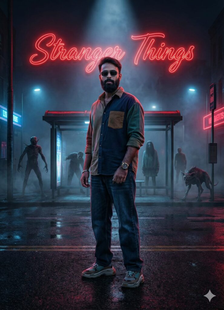 "A photorealistic cinematic portrait of a young man with a confident, bold expression, wearing stylish sunglasses. He stands firmly on a dark, wet main road at night. Behind him is a creepy, deserted bus stop. He is dressed in oversized casual streetwear: baggy jeans, a loose 'free size' shirt, chunky sneakers, and a wristwatch. The atmosphere is a dark horror scene, heavily bathed in dramatic volumetric dual-tone neon lighting, mixing deep reds and electric blues. Large, glowing, cursive neon script spelling "STRANGER THINGS" dominates the background wall. A sharp beam of light focuses specifically on his face and sunglasses, highlighting the details. 8k resolution, hyper-detailed, film grain." Don't change faces